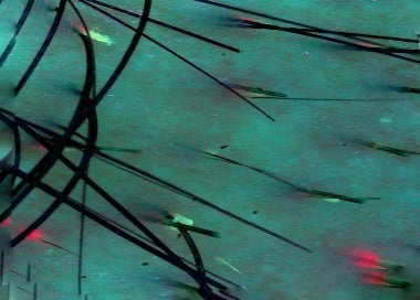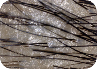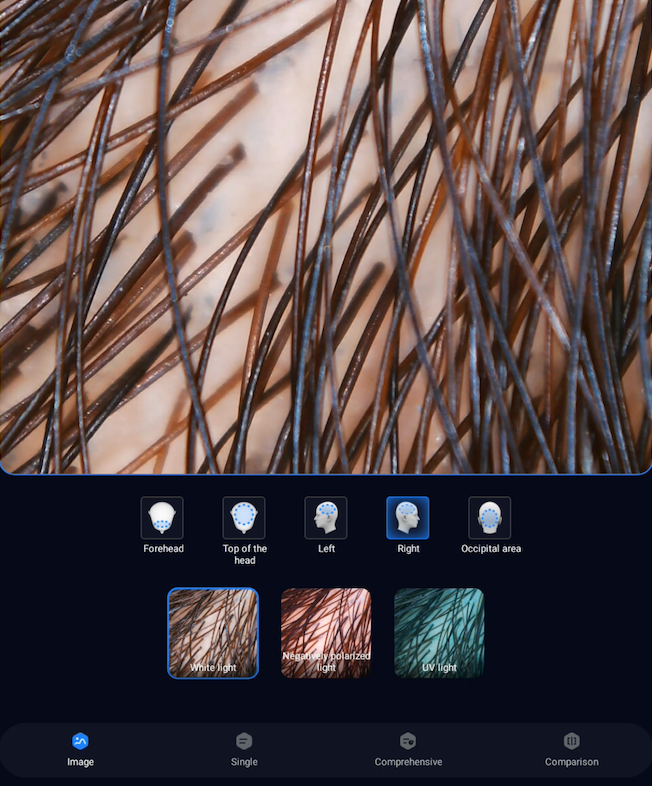 Using a special cross-polariser lens, direct reflected light from the scalp surface is minimised. This allows images formed by light reflected from the basal layer and dermis to enter the lens. Since these deeper layers are rich in melanin and hemoglobin, this mode visualises deep scalp conditions, including capillaries, pigmentation, and follicle health.